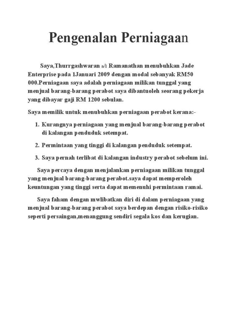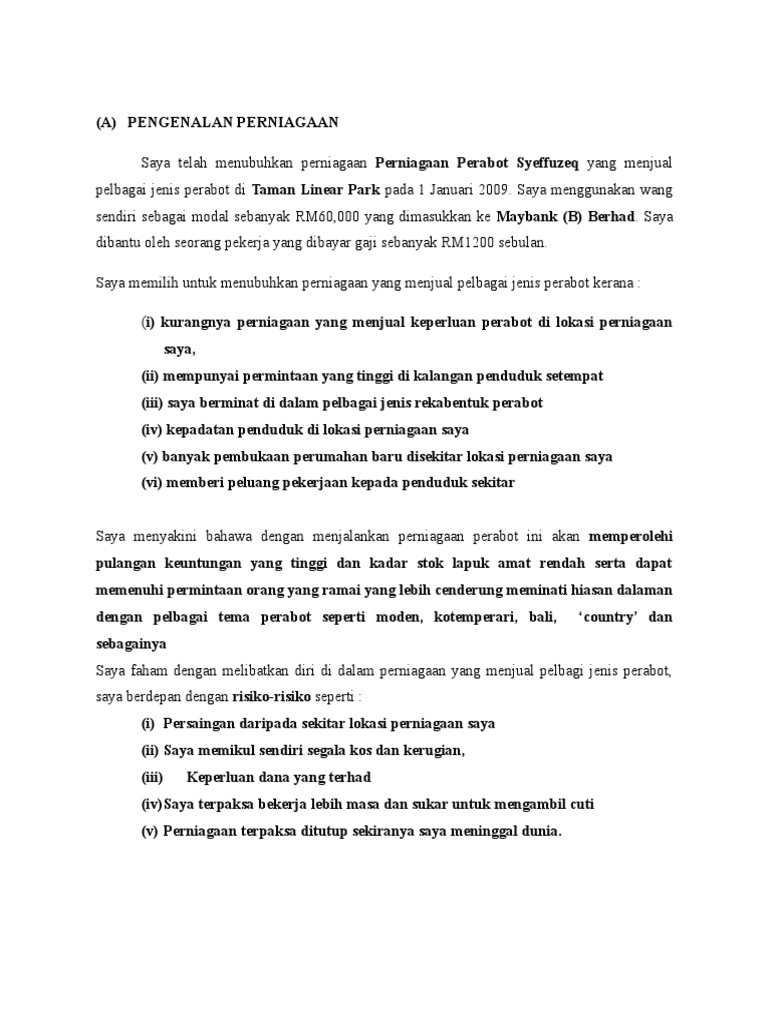 Pada permulaan saya tak tahu untuk ambil perabot dari mana. Luputnya makanan dan minumanJika setiap hari lauk dan menu tidak habismaka ianya. 2 10 PERNIAGAAN PERSEKITARANNYA 11 Pengenalan kepada perniagaan i.